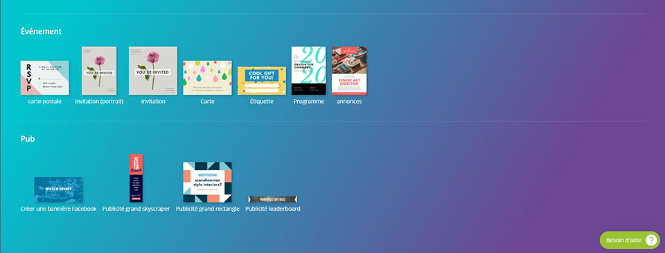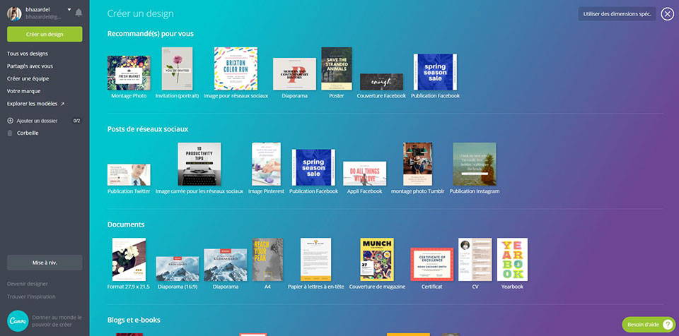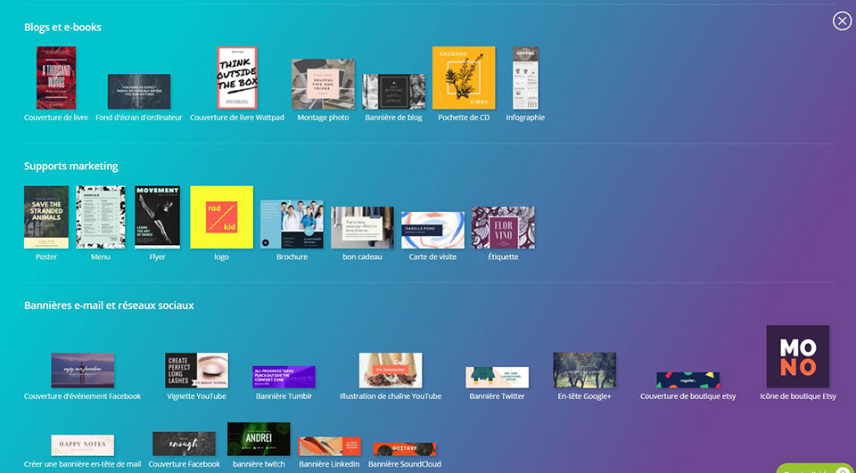 En quelques clics on se créé un compte (gratuit). Puis enfin les design proposés selon ce que vous recherchez. Que ce soit pour un blog, pour les réseaux sociaux, pour un document, un support marketing, un événement ou bien encore une publicité.